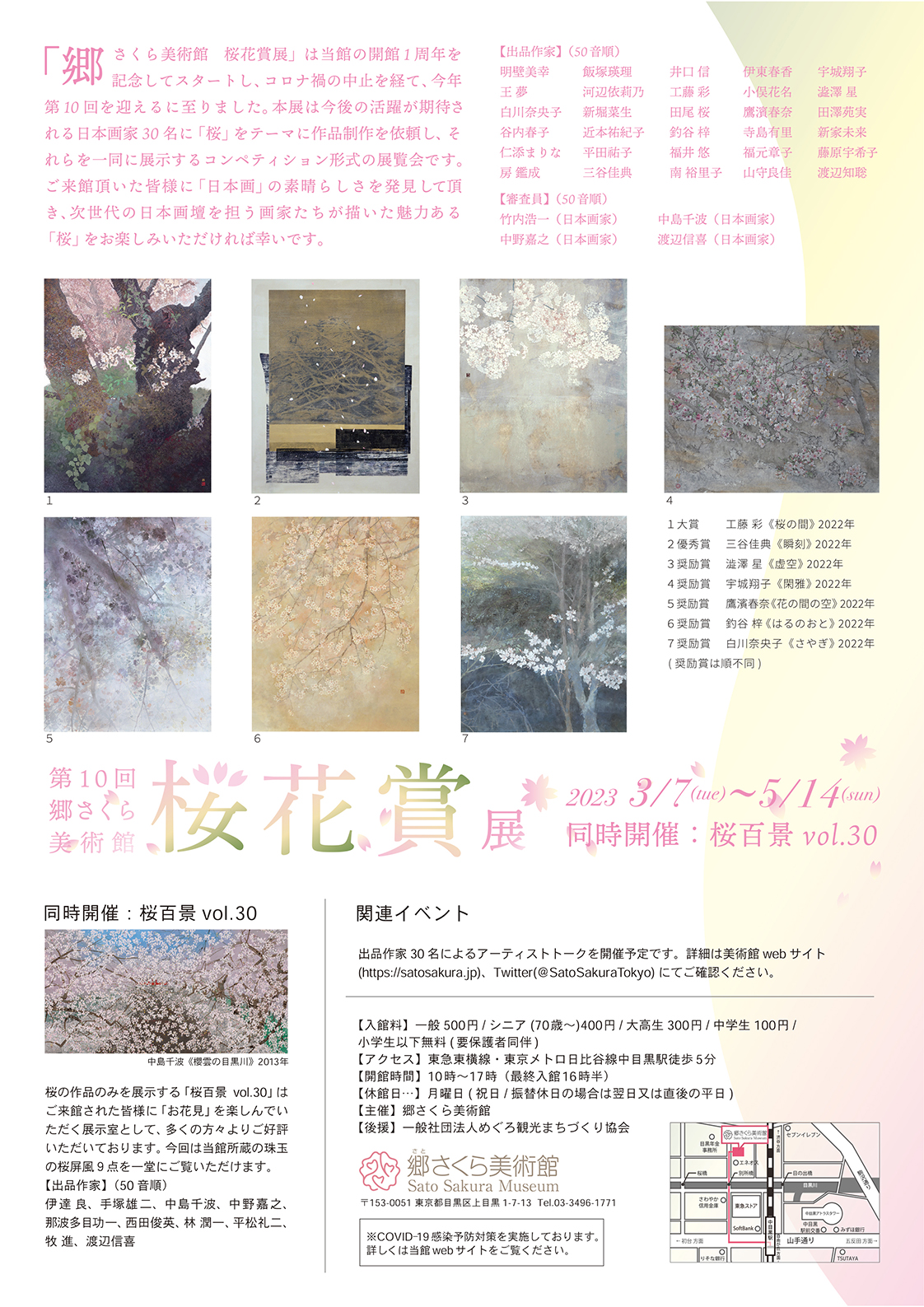 展覧会 2023年 第10回 郷さくら美術館 桜花賞展 第10回 郷さくら美術館 桜花賞 展 English here 「展覧会チラシ表」 「展覧会チラシ裏」 会期:2023年3月7日(火)- 5月14日(日) 主催:郷さくら美術館 後援:一般社団法人めぐろ観光まちづくり協会 開館時間:10:00-17:00(最終入館 16:30) 休館日:月曜日 展示作品 第10回 郷さくら美術館 桜花賞 大賞 工藤 彩《桜の間》2022年 第10回 郷さくら美術館 桜花賞 優秀賞三谷佳典《瞬刻》2022年 第10回 郷さくら美術館 桜花賞 奨励賞 宇城翔子《閑雅》2022年 澁澤 星《虚空》2022年 白川奈央子《さやぎ》2022年 鷹濱春奈《花の間の空》2022年 釣谷 梓《はるのおと》2022年 美術館からのごあいさつ 郷さくら美術館では「第10回 郷さくら美術館 桜花賞展」を開催いたします。本展は、当館の開館1周年を記念してスタートした展覧会ですが、コロナ禍の中止を経て再開し、今年で第10回を迎えるに至りました。今後の活躍がますます期待される若手日本画家30名に「桜」をテーマにした作品を描いて頂きました。これからの日本画壇を担う、気鋭の画家たちが描いた魅力ある作品を堪能して頂ければ幸いです。優美さ、力強さなど多種多様な表情を持つ桜。現代日本画家たちの個性豊かな桜花の美しさを、どうぞお楽しみください。 【出品作家】 明壁美幸、飯塚瑛理、井口 信、伊東春香、宇城翔子、王夢、河辺依莉乃、工藤 彩、小俣花名、澁澤 星、白川奈央子、新堀菜生、田尾 桜、鷹濱春奈、田澤苑実、谷内春子、近本祐紀子、 釣谷 梓、寺島有里、新家未来、仁添まりな、平田祐子、福井 悠、福元章子、藤原宇希子、 房 鑑成、三谷佳典、南 裕里子、山守良佳、渡辺知聡 (五十音順) 同時開催:「桜百景 vol.30」展 満開の桜の作品だけを展示する「桜百景vol.30」は、桜の名所である目黒川のほとりに位置する当館へお越しいただいた方々に「お花見」を楽しんでいただくための展示室として設置し、数多くの方々よりご好評をいただいております。 今回は、当館所蔵の中から桜の屏風9点を一堂にご覧いただける貴重な機会となっております。屏風に描かれた大迫力の桜をどうぞお楽しみください。 【出品作家】 中島千波、中野嘉之、那波多目功一、西田俊英、林潤一、平松礼二、渡辺信喜、他(五十音順) 展示作品 中島千波《櫻雲の目黒川》2013年 平松礼二《路・滝桜図》1997年 出品リスト ※美術館内での出品リストの配布は行なっておりません。 ペーパーレス化へのご協力をお願いいたします。 アーティスト・トーク日程表